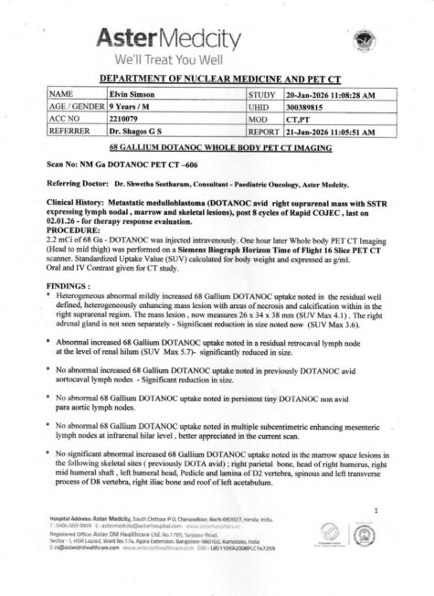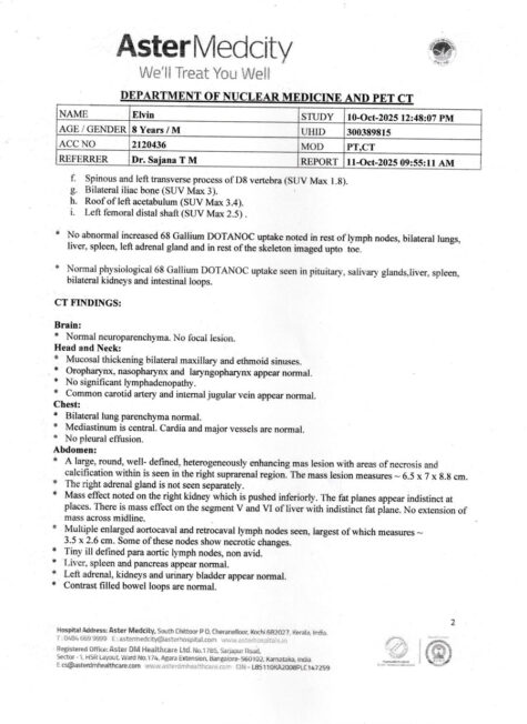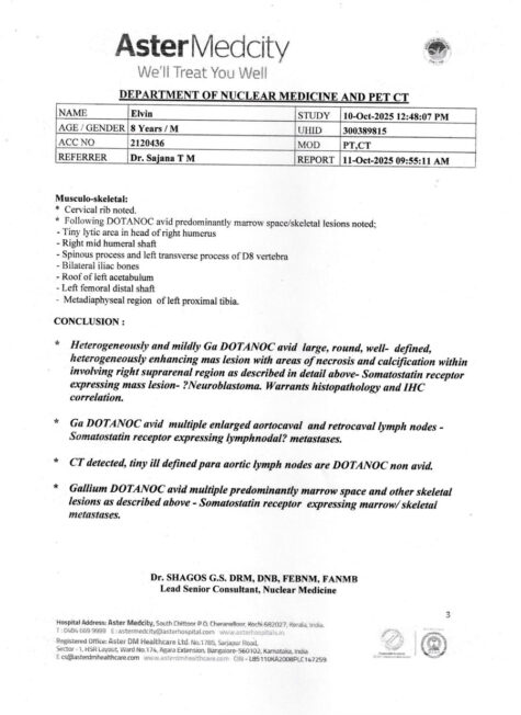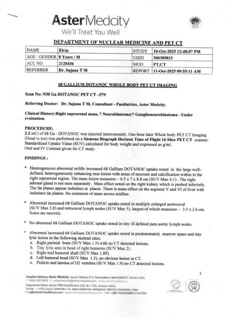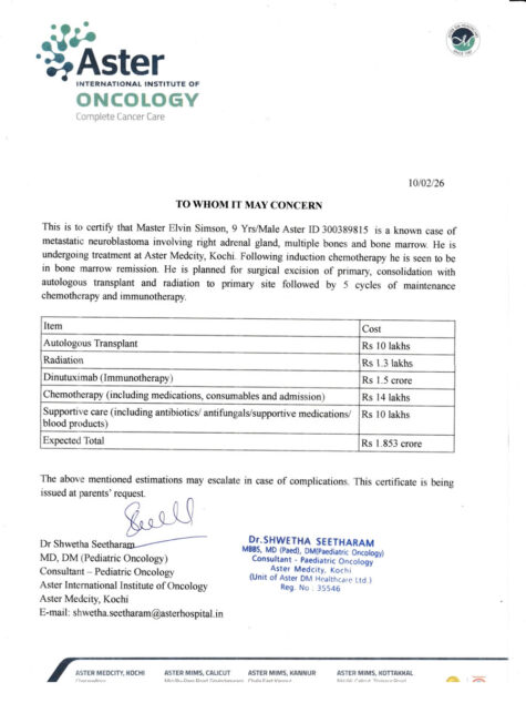 Elvin has been diagnosed with Metastatic Neuroblastoma, an aggressive form of cancer and has been admitted to Aster Medcity Hospital, Kochi.