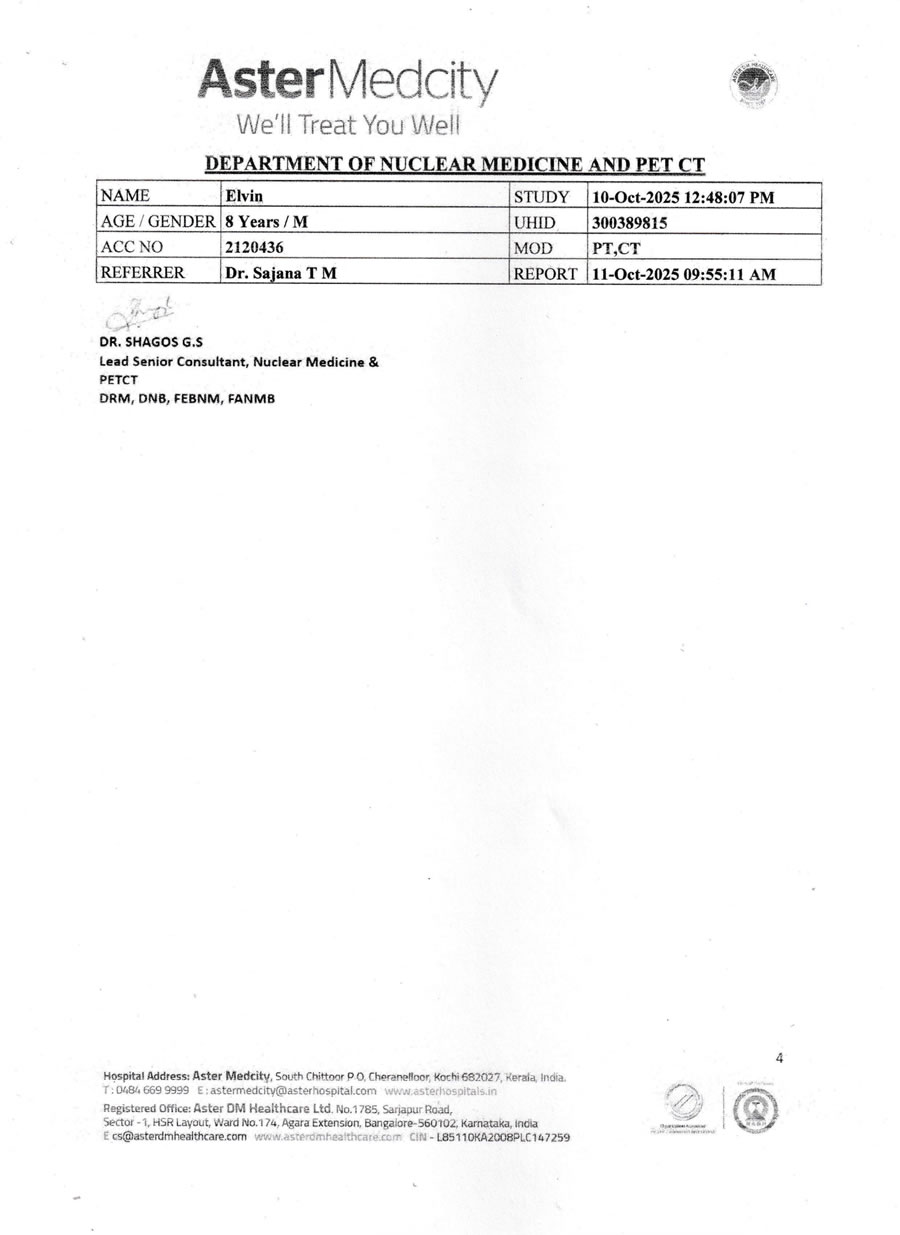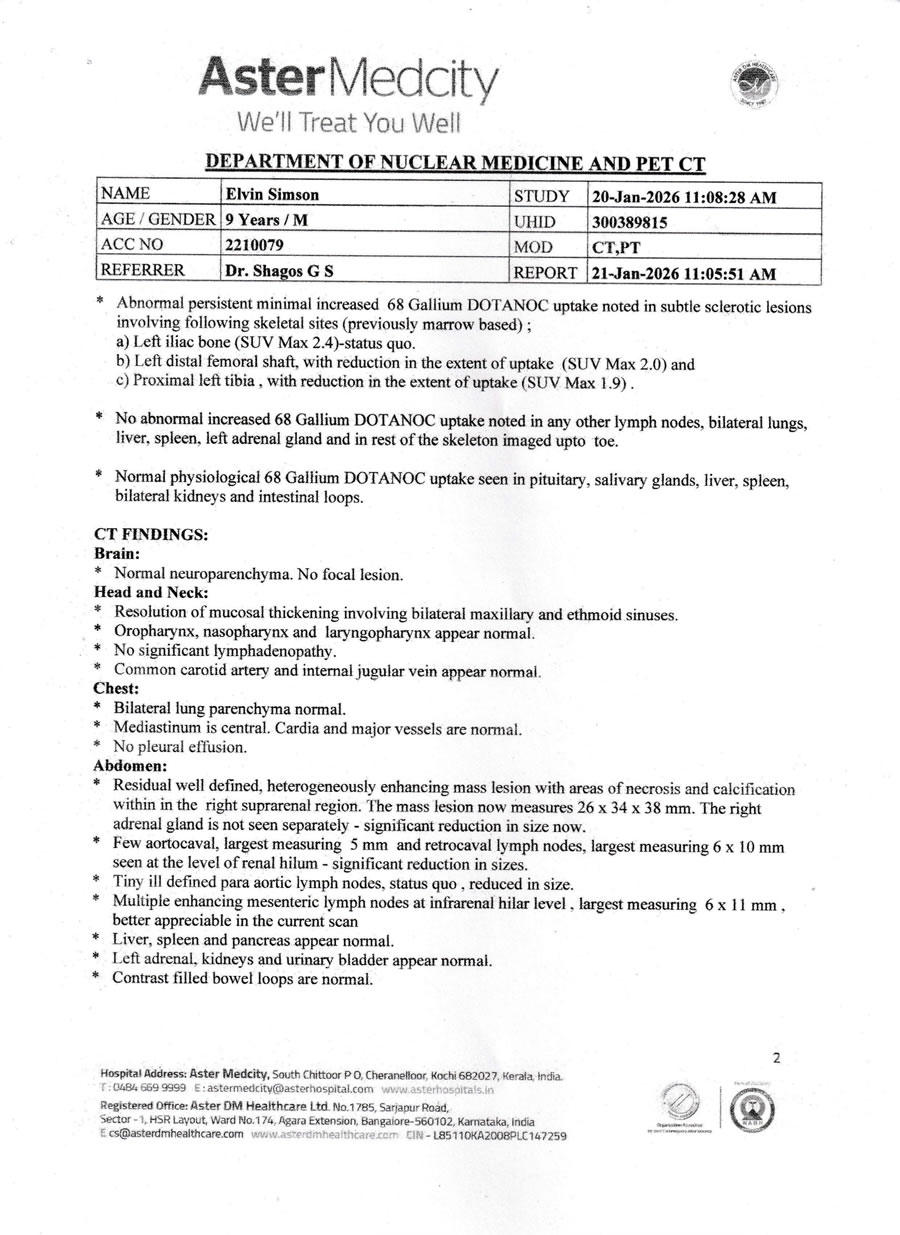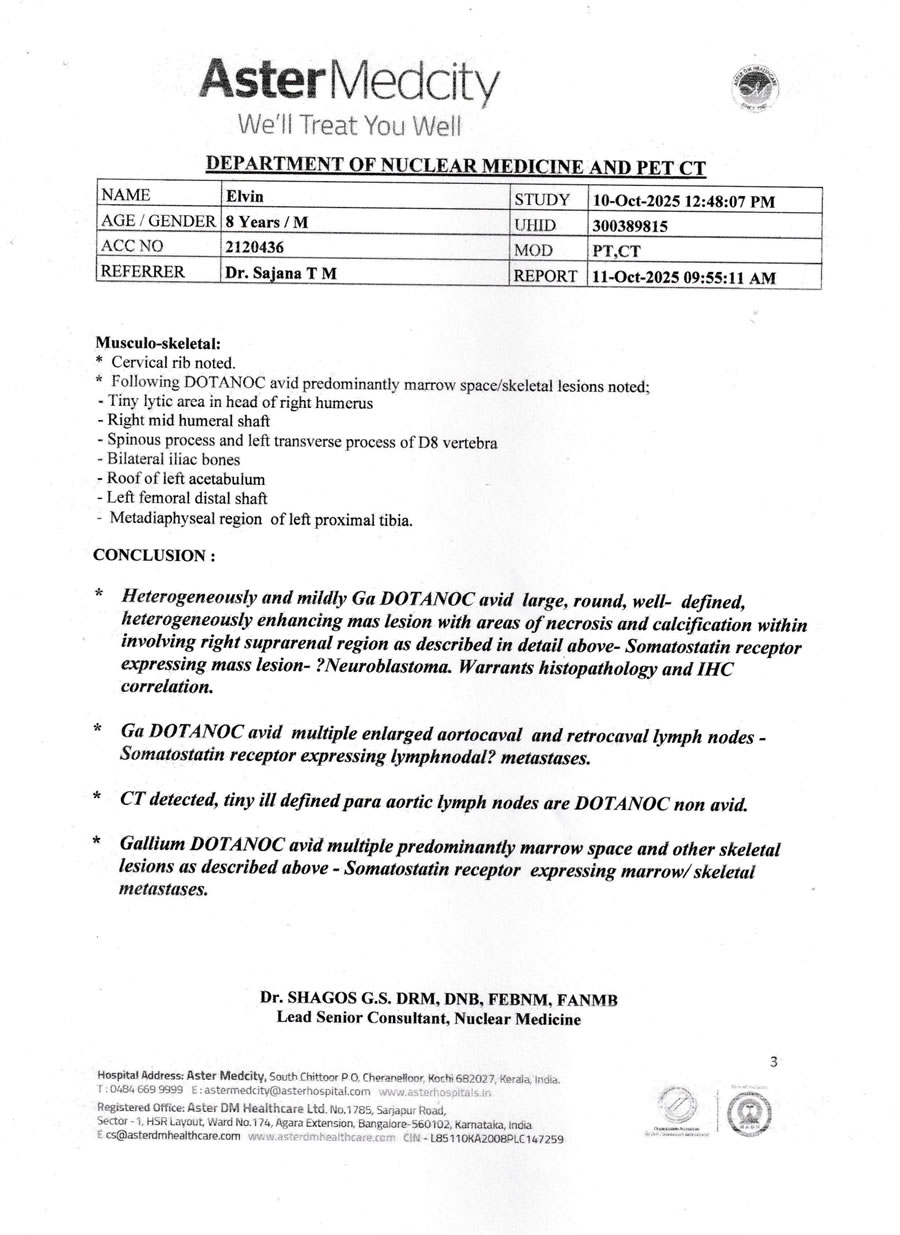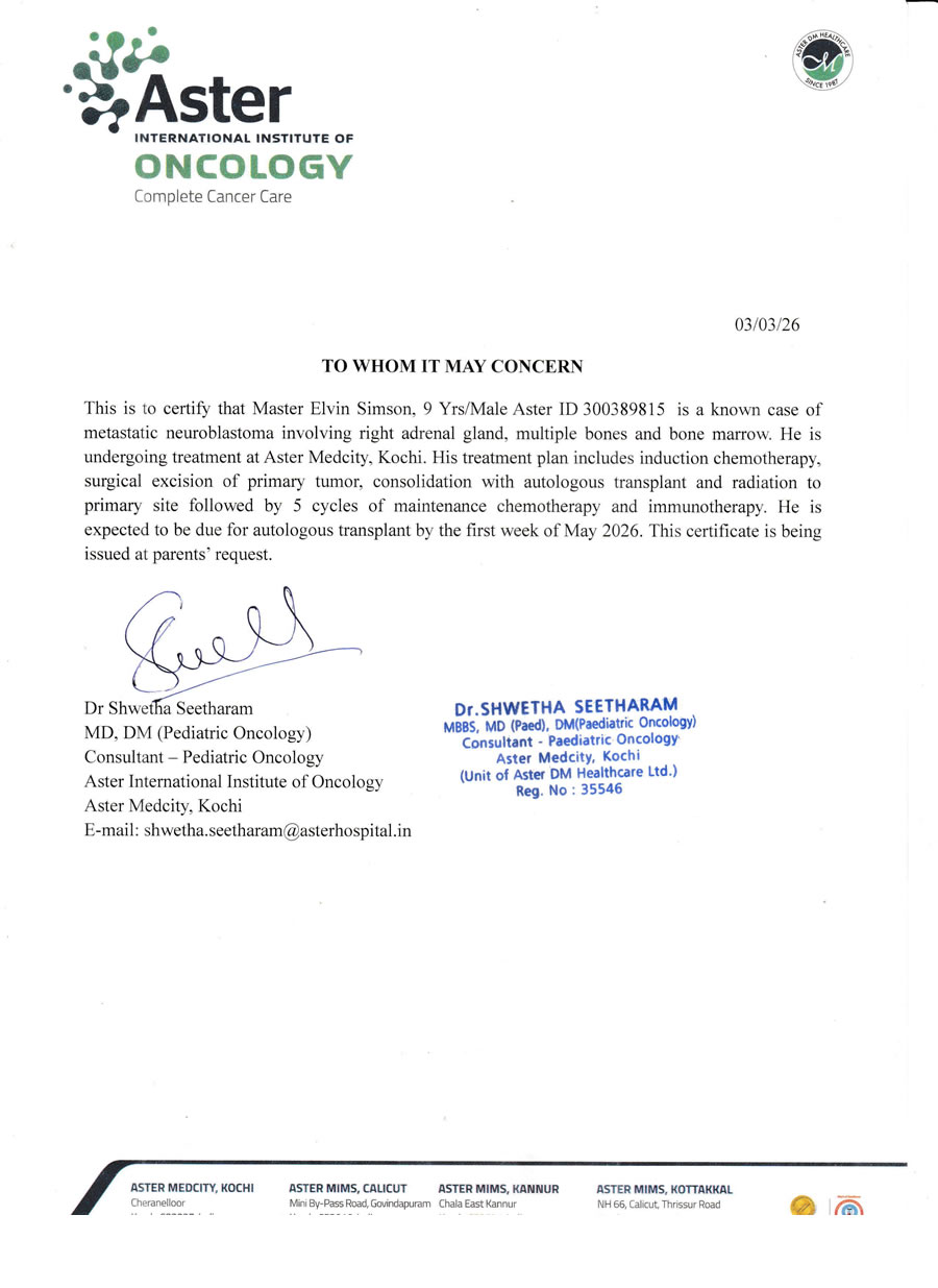 Elvin has been diagnosed with Metastatic Neuroblastoma, an aggressive form of cancer and has been admitted to Aster Medcity Hospital, Kochi.